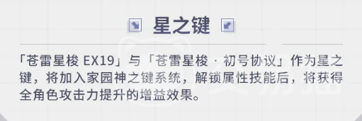 「苍雷星梭EX19」与「苍雷星梭·初号协议」均已纳入家园神之键系统。解锁对应属性技能后,全角色基础攻击力获得提升,该增益作用于账号全局,长期收益明确。