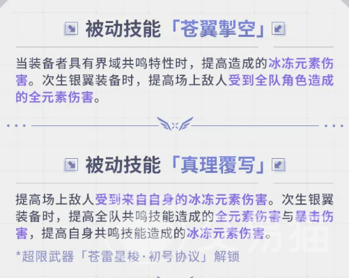 被动技能「苍翼掣空」生效条件为角色拥有界域共鸣特性,可提升冰冻伤害。次生银翼装备本武器时,进一步扩展增益范围,使场上所有敌人承受的全队各元素伤害提升。另一被动「真理覆写」则强化敌人所受冰冻伤害,并提升全队共鸣技能的全元素伤害与暴击伤害;同时,自身共鸣技能的冰冻伤害额外上浮。双被动叠加形成显著输出增幅。
