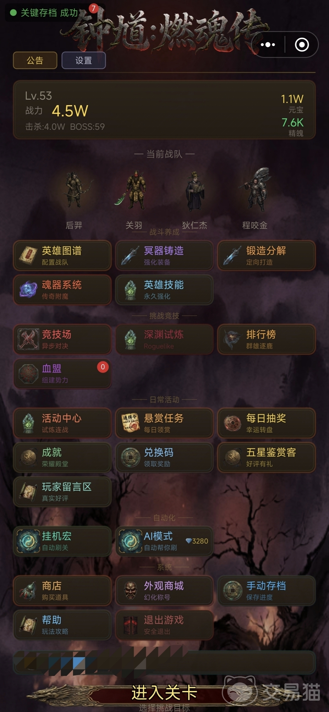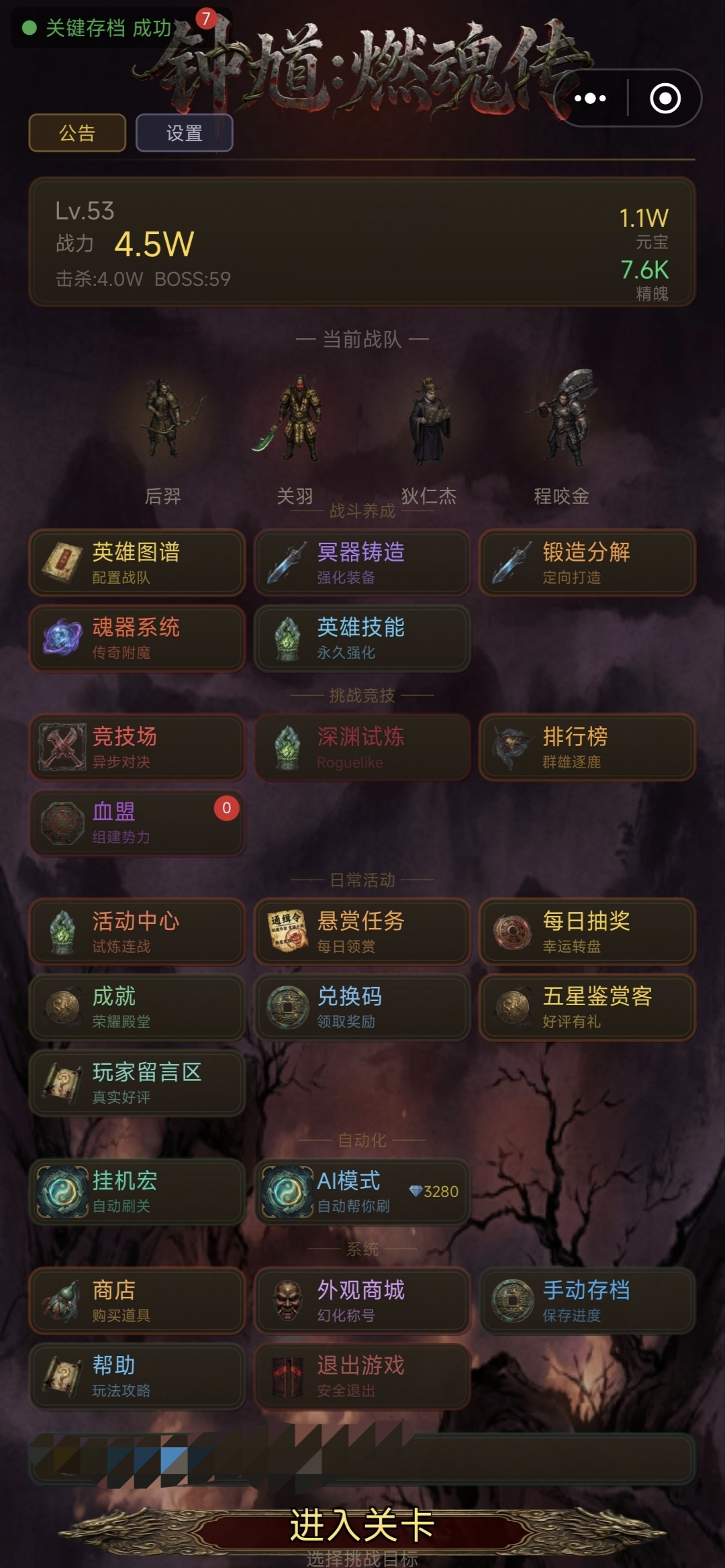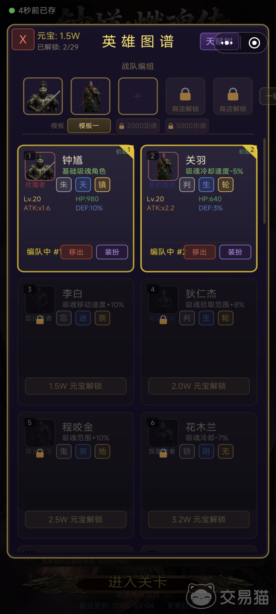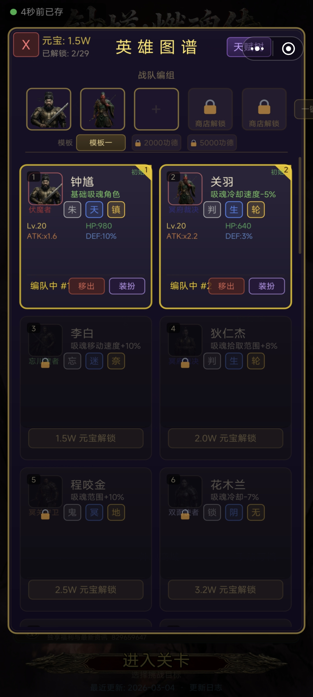 英雄初始仅解锁一项核心技能,后续技能树需通过事件奖励、关卡宝箱及市集兑换逐步解锁。资源获取途径包括:完成日常“巡阴令”、挑战高阶“九幽副本”、参与限时“地脉涌动”活动等。所有技能与装备均支持定向强化,同一角色可配置多套技能组合,适配不同关卡机制需求。随着主线推进,关卡难度呈阶梯式提升,阵容需持续迭代——例如前期侧重生存续航,中后期则需引入群体压制与反控手段。