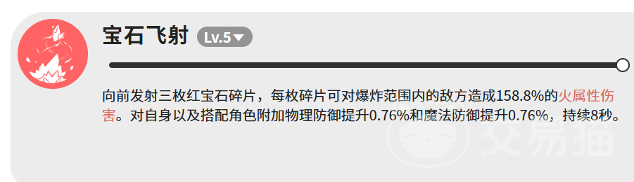 技能体系共包含三项核心能力:宝石飞射、火球、宝石撞击。其中宝石飞射为5级解锁的核心技,可向前发射三枚红宝石碎片,每枚落地后触发范围爆炸,对范围内目标造成158.8%火属性倍率伤害。该技能同时附带团队增益效果:使自身及编队内其他角色获得物理防御+0.76%、魔法防御+0.76%,持续8秒。虽然单次增幅有限,但可随释放次数叠加,在中长期作战场景中有效提升队伍容错率。