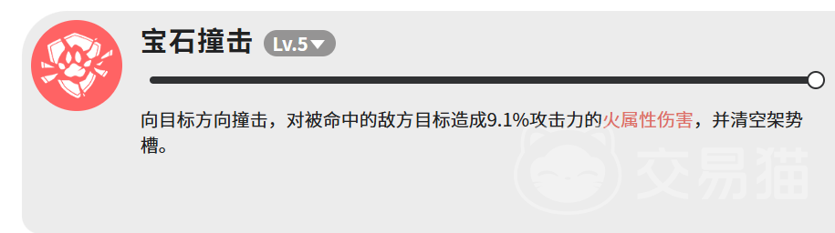 宝石撞击作为第三项5级技能,表现为直线突进撞击,命中后造成9.1%攻击力的火属性伤害。尽管基础伤害较低,但具备关键机制效果——完全清空目标架势槽。在面对架势槽厚重的精英敌人或Boss时,该效果可打断其蓄力动作、重置攻击节奏,从而改变战局走向。