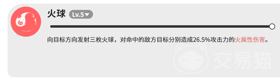火球为另一项5级技能,向指定方向投掷三枚火球,每枚命中后造成26.5%攻击力的火属性伤害,合计输出达79.5%。该技能施放稳定、命中率高,适用于清理低血量单位或分散配置的敌方单位,属于实用型补刀手段。