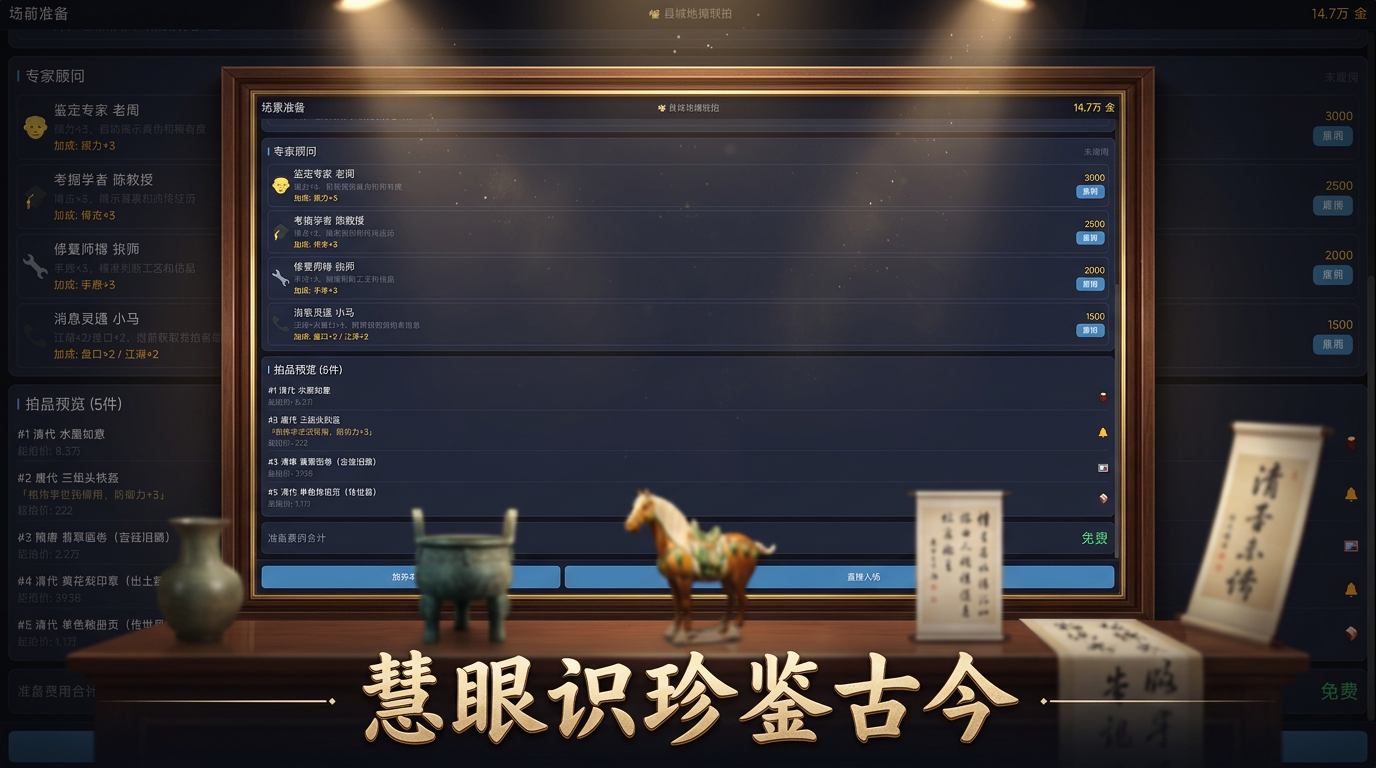 游戏深度还原了多层次拍卖场景:从常规日拍到高风险夜场限时闪拍,每一场竞逐都考验着玩家对器物年代、工艺、包浆、款识等细节的综合判断力。值得注意的是,夜场不公开标的详情,赝品率稳定维持在四成左右,极大提升了决策难度。新手可先从数百至数万元区间内的标的入手练习,循序渐进掌握断代逻辑与市场行情。