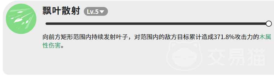 “飘叶散射”为范围持续型技能,作用于前方矩形区域,期间连续发射多片叶状能量,累计造成371.8%攻击力的木属性伤害。该技能适用于敌方密集分布场景,单体目标亦可有效压制,前提是需维持目标处于技能覆盖区域内。