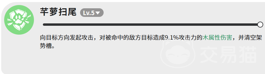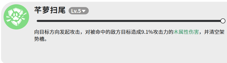 终技“芊萝扫尾”虽仅造成9.1%攻击力的木属性伤害,但具备关键战术价值——可完全清空敌方架势槽,使其陷入硬直状态。这一控制效果为后续高伤技能创造理想输出窗口,是整套连招中不可或缺的节奏调节器。