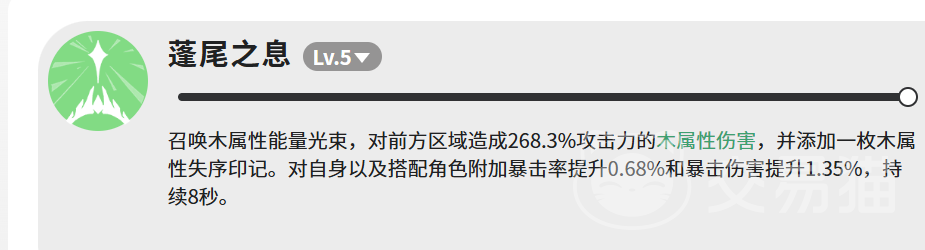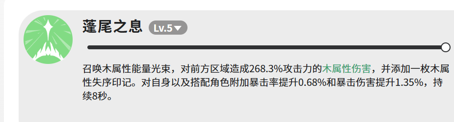 核心技能“蓬尾之息”可释放一道木属性能量光束,对前方区域造成268.3%攻击力的伤害,并附加一枚木属性失序印记。此外,该技能还能为自身及协同作战的角色提供持续8秒的增益效果:暴击率提升0.68%,暴击伤害提升1.35%。尽管数值增幅看似有限,但失序印记的存在显著强化了后续技能的衔接效率与整体输出潜力。