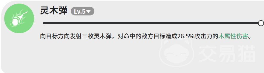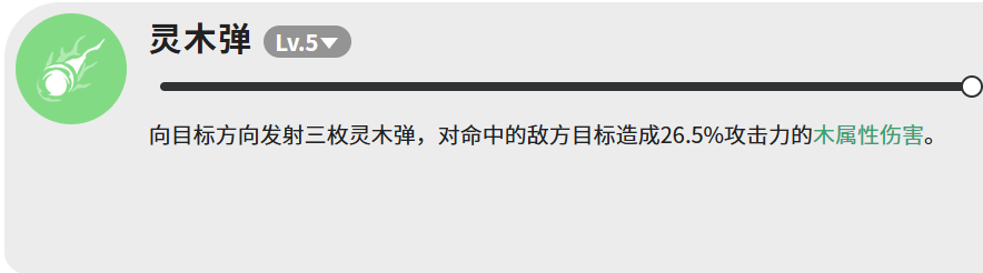 “灵木弹”属于快速响应型技能,向指定方向发射三枚独立判定的灵木弹,每枚命中造成26.5%攻击力的木属性伤害,总计约79.5%攻击力。因其多段命中特性,在应对多个分散目标或填补技能空档期时表现尤为实用。