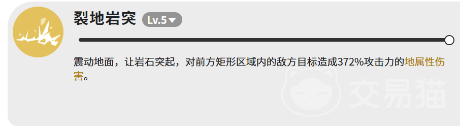 输出端技能【裂地岩突】满级可造成372%攻击力的地属性伤害,攻击判定为前方矩形区域,具备可观的群体压制能力,适用于多目标环境下的节奏控制与伤害补充。
