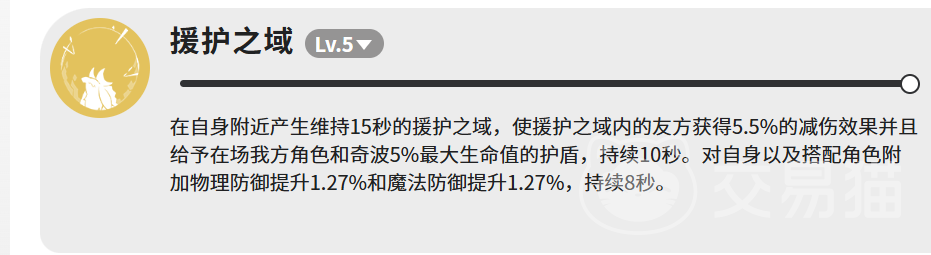 核心主动技能【援护之域】(满级LV.5)具备三重协同效果:首先,在加杜周围生成持续15秒的领域,使范围内友方单位获得5.5%伤害减免;其次,为全体我方角色及奇波施加等同于各自最大生命值5%的护盾,持续10秒;最后,加杜自身及与其编队的角色额外获得1.27%物理防御与1.27%魔法防御提升,持续8秒。该技能不依赖单体站位,覆盖范围广,且护盾量随角色血量成长,越到高练度阶段,团队容错率提升越明显。
