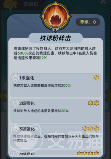 作为功能性前排,陈国汉的设计重心始终围绕“承伤—控场—支撑”三位一体展开。初始阶段即可稳定承担高额物理伤害,被动抗性成长曲线平滑;主动技能具备范围打击效果,在应对多目标战斗场景时,既能分摊伤害压力,又能提供基础AOE输出补充。随着角色等级提升及进阶节点解锁,其核心机制逐步激活——不仅强化自身站桩稳定性,更显著提升后排输出环境的安全阈值,有效遏制敌方突进切后排行为。其标志性必杀技“铁球”,是兼具群体压制与生存反制的关键技能。