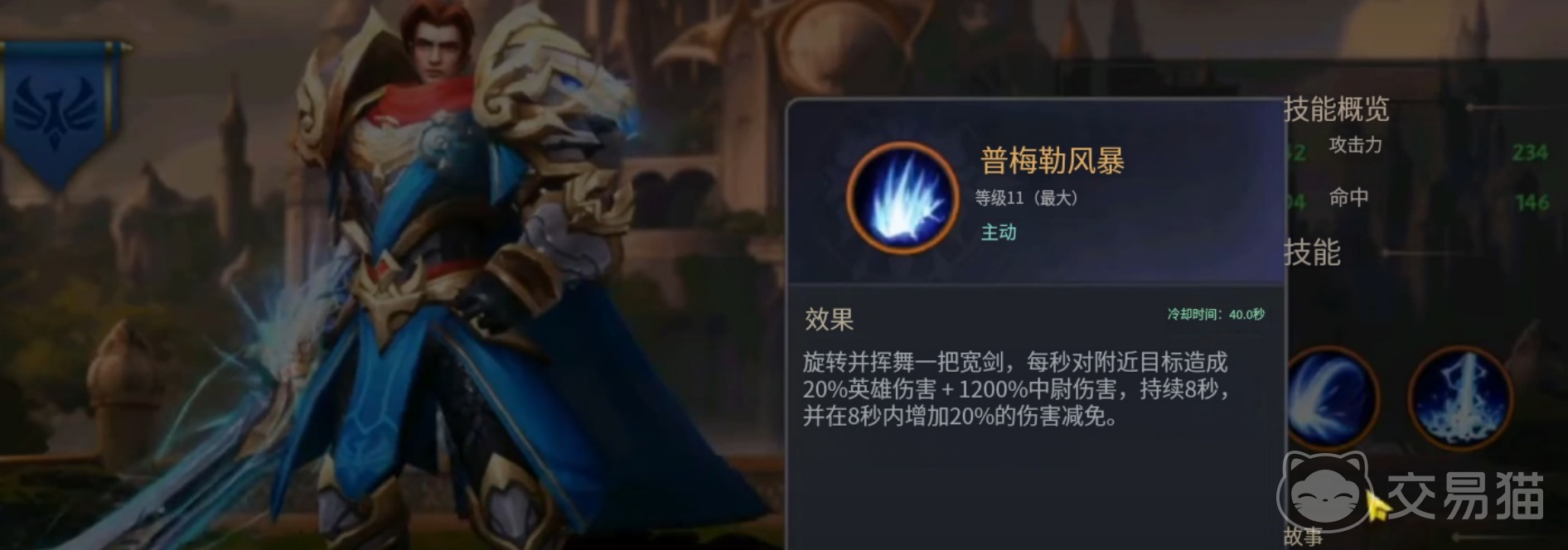 其主动技能“普梅勒风暴”在等级11满级状态下,拥有40秒冷却时间,技能持续8秒,期间对范围内敌人造成20%英雄伤害与1200%中尉伤害,并同步提供20%全伤害减免。这一“攻防一体”特性使其在群怪环境中兼具清场效率与生存韧性,完美呼应其抵抗军领袖的背景设定——既能持续站桩输出,又能保障自身不被集火压制。