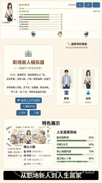 想要提前感受真实职场环境,探索多元职业路径,甚至预演不同人生阶段的发展可能?《职场新人模拟器》正是一款以文字叙事与场景化图像相结合的沉浸式模拟游戏。它不依赖复杂操作,而是通过细腻的职场情境设计,让玩家从新人视角出发,深度体验互联网大厂、中型科技企业及初创团队等不同类型组织的工作节奏与生态差异。那么,这款游戏是否具备足够的可玩性与现实参考价值?本文将基于目前已公开的核心机制与系统设定,为你系统梳理其特色玩法与成长逻辑。