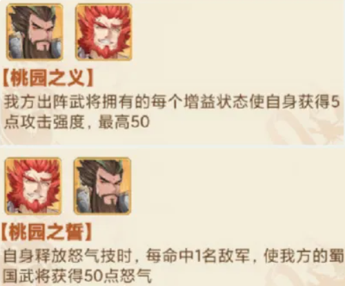 若聚焦于关羽与张飞的双人组合,则可分别激活“桃园之义”与“桃园之誓”双重羁绊。“桃园之义”设定为:我方每存在1个增益状态,两人各自获得5点攻击强度提升,上限达50点;而“桃园之誓”则在每次我方武将成功命中敌方单位后,为所有蜀国出战武将额外提供50点怒气值,且无人员数量限制。两项效果可同步生效——攻击强度提升直接强化输出能力,怒气叠加则加速技能循环,二者叠加后显著提升整体爆发频率与持续作战能力。