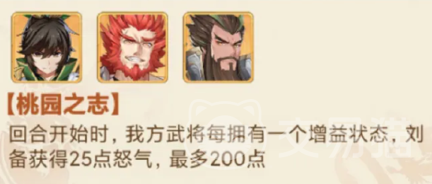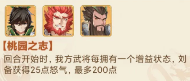 以“桃园之志”为核心代表的蜀国基础羁绊,需由刘备、关羽、张飞三人同时上阵方可激活。该羁绊在每回合开始时自动生效,为我方全体武将提供初始增益状态。特别值得注意的是:每当任一我方武将携带1个增益效果,刘备即可额外获得25点怒气值,该效果可叠加至最高200点。这意味着刘备不仅承担前排承伤与治疗职能,更因高频率怒气积攒而具备极强的技能释放节奏控制能力,是构建高生存、高续航蜀国体系不可或缺的中枢节点。