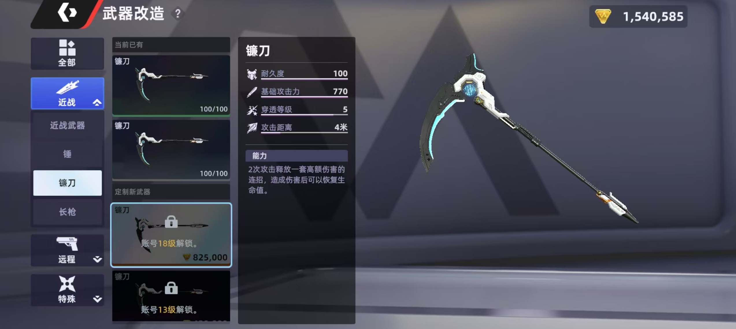 镰刀的基础攻击为双面挥砍,单次命中伤害数值处于近战梯队前列,但攻击判定距离偏短,需贴近目标方可生效。其核心机制在于“二连击触发强化连招”:完成两次普攻后自动衔接一套多段高额伤害组合技,且该连招命中敌人时可按比例恢复使用者生命值。目前版本中,镰刀是全近战武器中唯一具备实战化吸血能力的装备,这一特性使其在持续交火中拥有显著的生存优势。