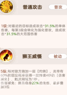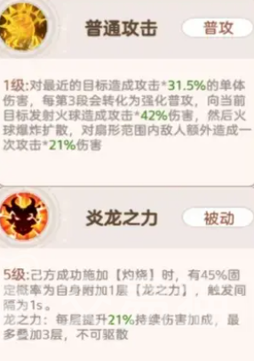 小炎龙的普攻即具备约30%的单体伤害,并在每完成三段攻击后强化下一次火球投射,使其单次火球伤害提升至42%;火球爆炸后还可向邻近目标扩散伤害。其被动“炎龙之力”在触发后,有固定概率赋予自身“龙之刃”状态——该状态可叠加至三层,每层提供21%的持续伤害加成。当小炎龙释放群体技能时,不仅造成高额范围伤害,更拥有较高概率为目标附加持续20秒的灼烧效果;而每一层灼烧被引爆时,均可产生375%的额外伤害,大幅抬升整体DPS上限。