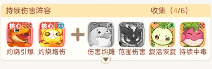 整套阵容无需依赖复杂操作或极限配速,仅需确保小炎龙与火仔的灼烧衔接顺畅,配合鸭宝的承伤调度、绿叶宝的复活保护及孢子草的毒伤补足,即可在各类副本与Boss战中稳定打出高频率、高倍率的持续伤害。即使遭遇强控阵容,本队亦可通过灼烧的不可驱散特性(部分层级)与引爆机制,维持可观的后台输出压力。