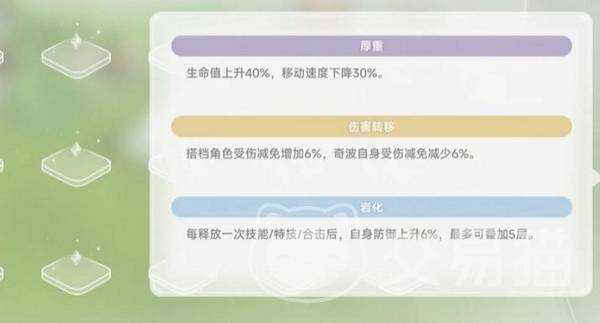 词条组合为【厚重】【伤害转移】【岩化】,分别带来减速状态下生命值提升、为搭档分摊所受伤害、每次施放技能时永久叠加防御数值的效果。该成长机制使其成为近战核心角色的理想搭档,尤其适配末音、法兰塔、诺诺等需深入敌阵输出的高机动战士型角色。