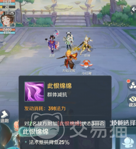 她的核心机制围绕两个专属技能展开,操作简洁、释放稳定。首个技能“此恨绵绵”消耗398功力,可同时作用于两名敌方目标,使其法术抵抗降低25%,效果持续三回合。该技能具备显著的先手价值:在战斗开局阶段使用,能为我方法术系输出神兽创造理想的输出环境,大幅提升后续群攻或单体爆发的实际伤害转化率。