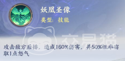 她的主动技能“凤翎”为单体攻击,优先锁定敌方后排脆弱单位,虽为单点伤害,但基础倍率扎实,适合作为开局首段压制手段。另一主动技“妖凰圣像”同样针对后排,造成160%基础伤害,并附带50%概率窃取目标1点怒气。该技能是怒气调度的关键节点,配合高频率普攻,可稳定维持我方怒气供给。