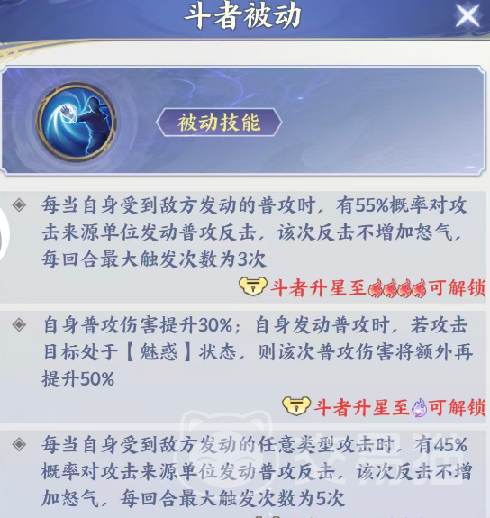 进阶版被动进一步强化其前排反伤定位:受击时触发反击的概率提升至45%,单回合最高可触发5次。该特性使其在前排承伤场景下具备极强的干扰与反打能力。但需注意,除普攻外,其余技能均无法为其积攒怒气。因此,在阵容配置中,应优先选择具备怒气恢复、怒气转移或吸怒能力的辅助型角色,以保障其怒气技能(如玄冰龙翔)的释放频率与连贯性。