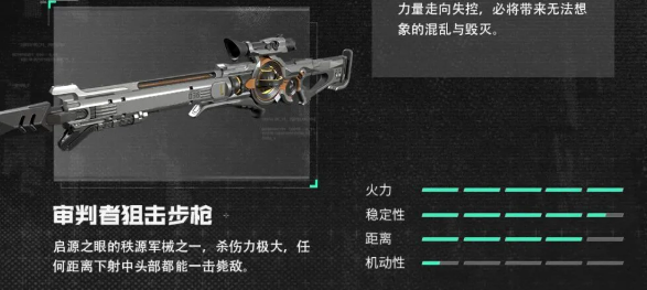 审判者狙击步枪:作为远程压制核心装备,该武器具备全距离头部命中即秒杀的终结能力。在开阔地形或关键点位架设时,可凭借超远射程与高单发伤害主导战场节奏。其主要限制在于移动速度偏低,但不可替代的瞬时击杀效率使其稳居当前版本T0梯队首位。