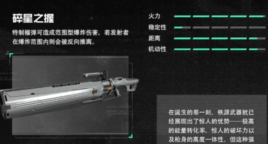 碎星之握:定位为团战AOE核心载具,搭载高爆榴弹发射机制,覆盖范围广、群体伤害密度高。实战中向敌方密集区域投掷即可触发大范围爆炸效果;其独有反冲位移机制可在造成伤害的同时将使用者自动弹离爆心,兼顾生存性与机动调整能力,是推进与反打阶段的关键战略资源。