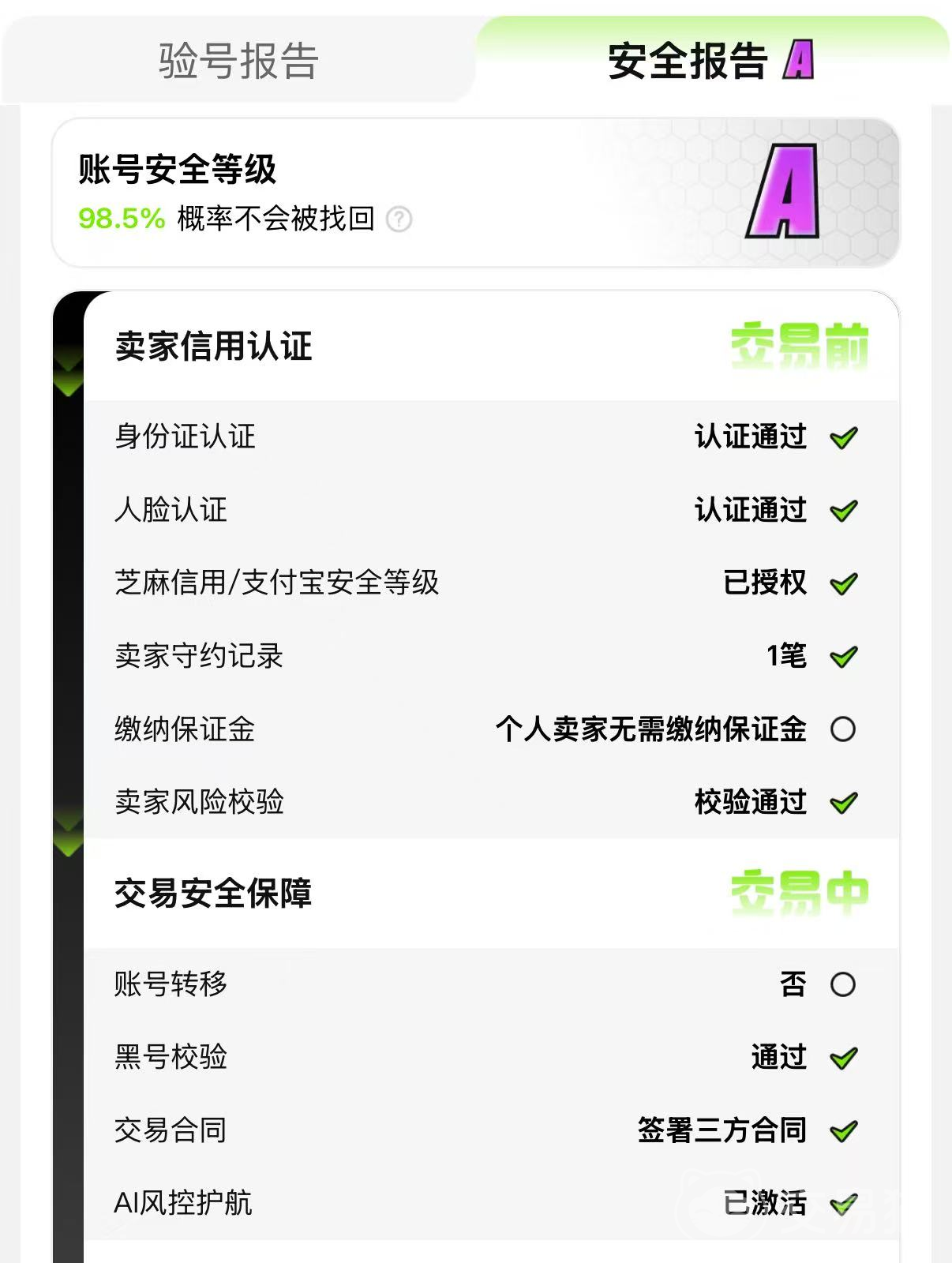 平台通过强实名管控确保都是真实的卖家,大家在选择商品的时候结合卖家的芝麻信用、守约记录、风险校验等多个方面来考量,和信用越高、守约记录越好的卖家进行交易,更容易买到优质的账号,交易的安全性也更高。