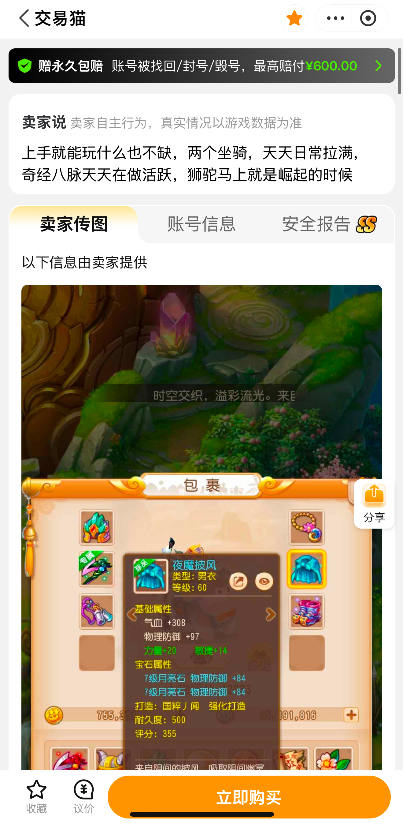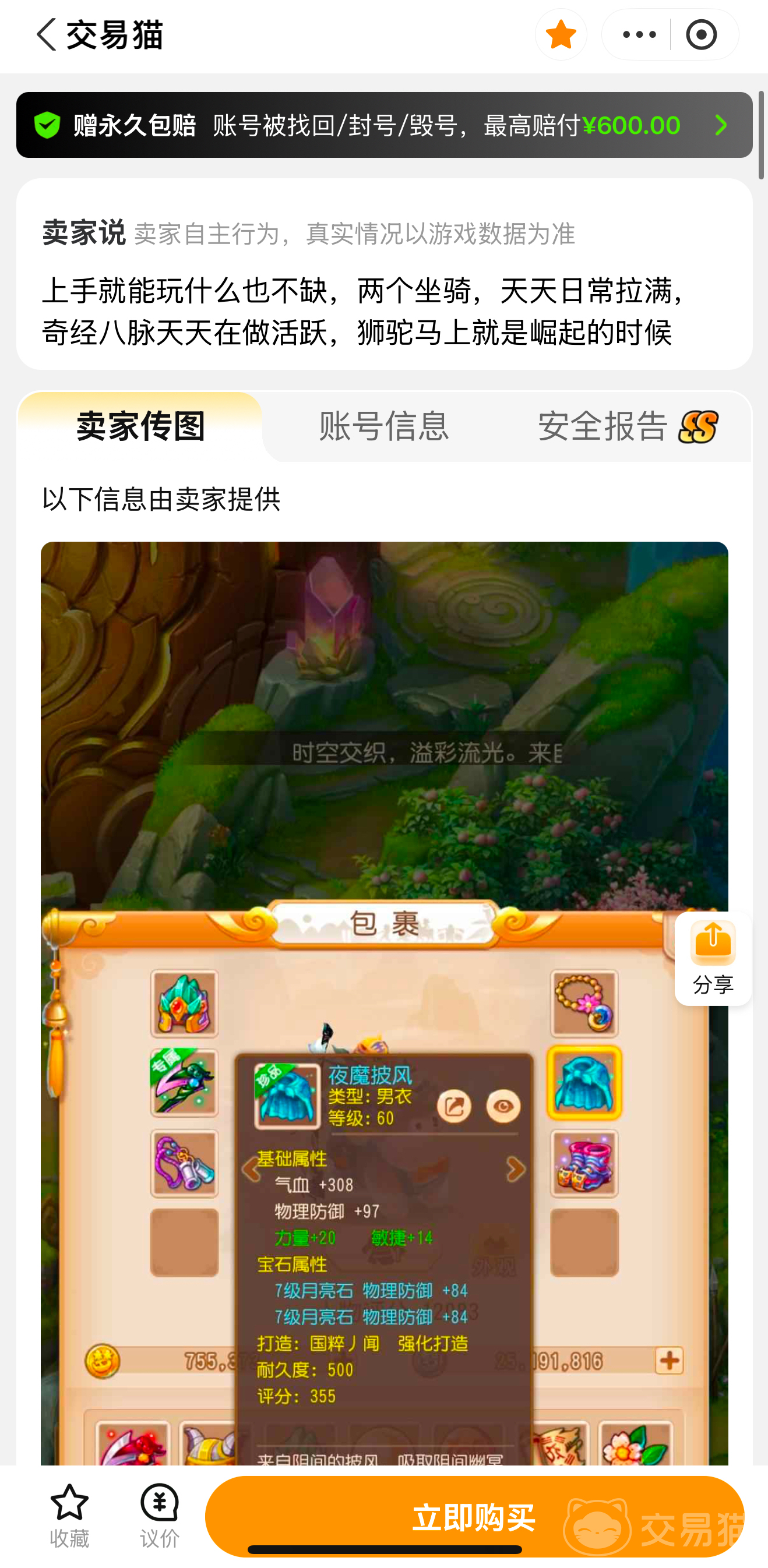 交易猫是阿里巴巴灵犀互娱旗下平台,安全有保障,也是业内目前唯一全场都赠送永久包赔服务的手游交易平台。从账号的上架到交易完成,全程为梦幻西游卖家保驾护航,打消卖号可能会被骗拿不到钱等顾虑。卖家完成简单的实名认证之后,只需要按照提示填写账号的门派、等级、修炼情况和装备详情等,上传真实的游戏截图,就能够快速上架账号。每一个账号都是玩家精心上架的真商品,官方验号让上架的账号信息更加真实、完整、准确。