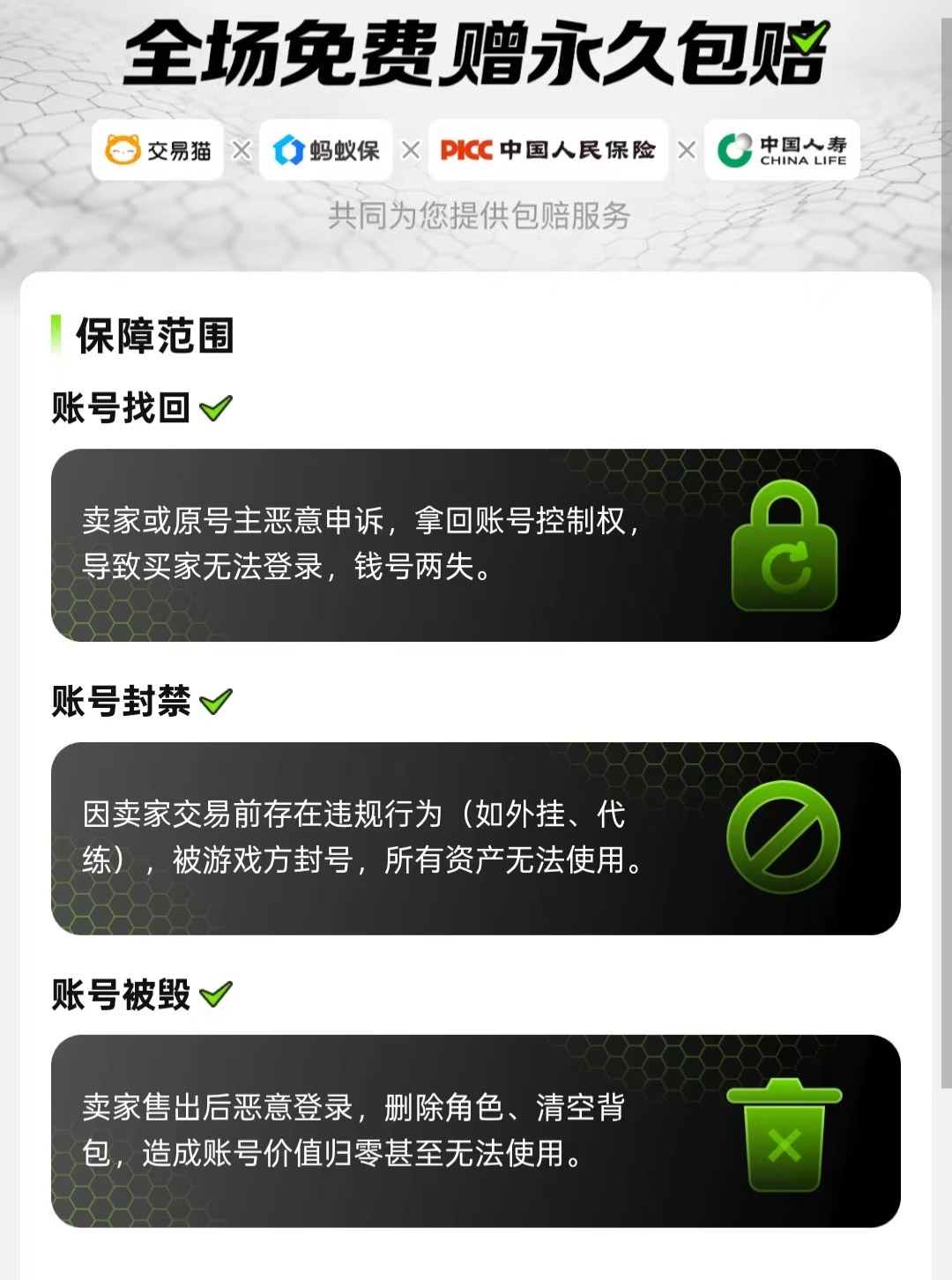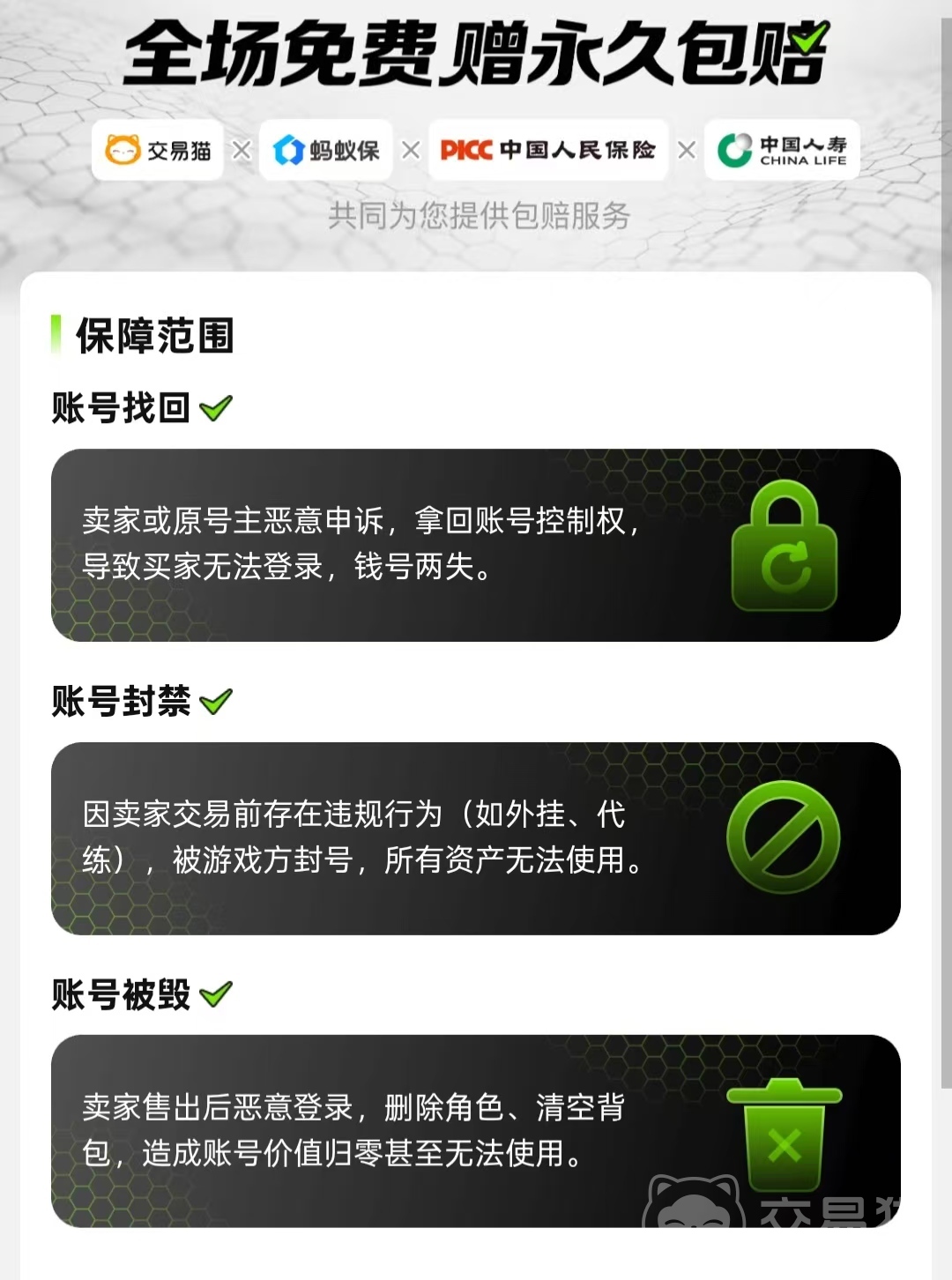 但也有一些人担心自己入手后就会被他找回或是盗号,其实这点不用担心,因为交易猫作为业内唯一一全场赠送【永久包赔】这项服务的平台,大家若是买号过程当中出现问题的话,就会按照规定赔付资金,以便维护好买家的利益。