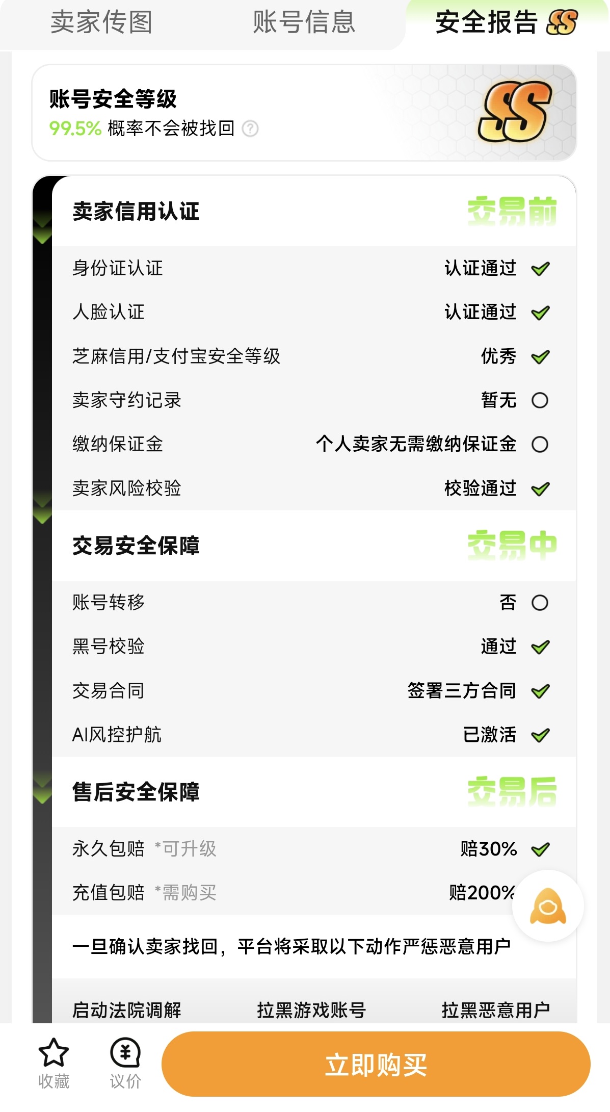 对于海岛奇兵这款游戏,首先是提供了非常详细的模板,可供买家挑选自己理想的账号。包括角色等级和奖牌数量等,这些都是最有价值的部分,此外还能通过搜索关键词的方式,再进行进一步查找。再就是可交易类型也很多,除了购买成品号之外,还能购买礼包、道具和代练等服务,这样就大大丰富了用户的可选项。在安全性方面,交易猫现在创造出了安全报告制度,结合信用认证、交易安全保障项目以及售后安全保障等多个方面进行综合评估。评估达到SSS或者是SS,那么就可以放心进行交易,基本不会被找回。每个账号在详情介绍的栏目中都可以直接看到安全报告的评级。通过这样的方式大大降低了交易过程中出现问题的可能性。