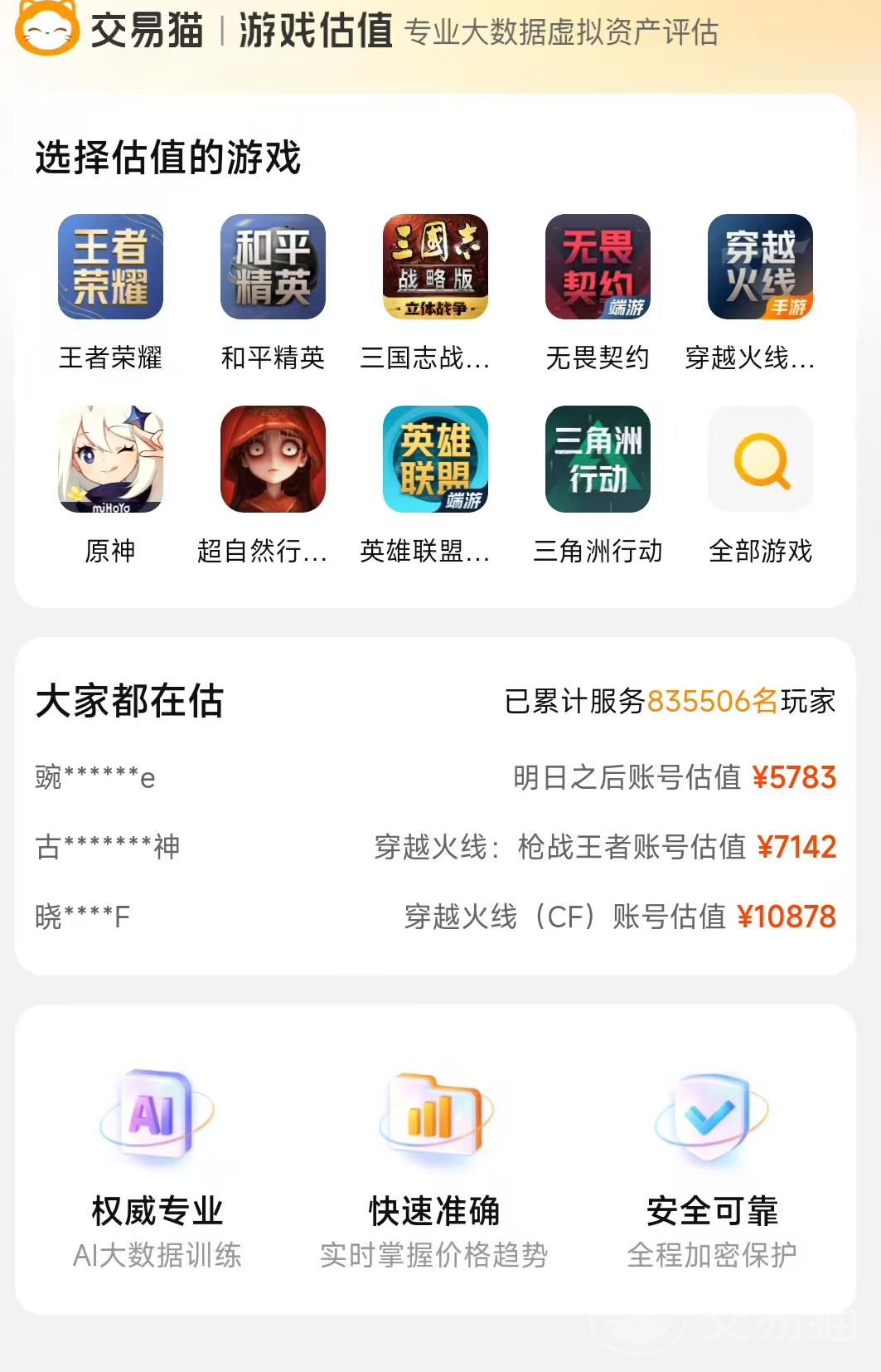 要是玩家们是想要出售账号的话,那交易猫平台可以提供免费的估价功能,该估价功能是经过专业ai进行分析的,会对账号的内容进行全面分析,并结合交易的市场行情,给出最合理的价格,该价格放在交易猫平台是很容易出售的,值得信任。