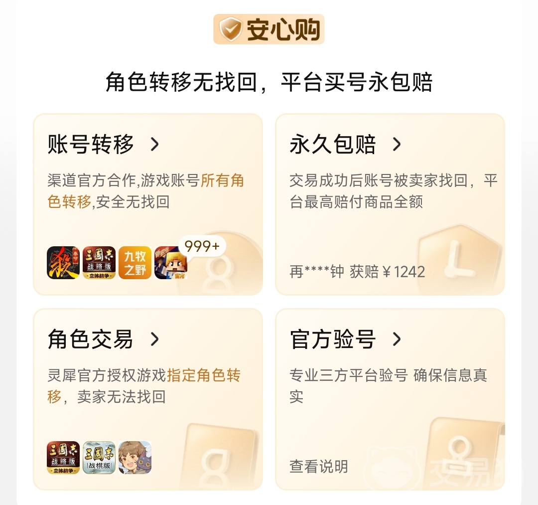 如果说玩家想要买号的话,交易猫的安全性不用担心。交易猫会对交易前,交易期间还是最为关键的交易完成后都有相关的服务保障内容,确保这是一个安全的交易,也就是平台首页上的介绍的【安心购】服务内容,让大家都拥有一次愉快的游戏账号交易。