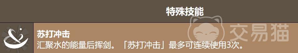 特殊技能「苏打冲击」具备三次独立释放机会,每次均凝聚水元素能量进行前向斩击,三次连击总伤害可观。该技能不仅提供稳定输出,更重要的是其释放后必然激活「课后练习」强化状态,为后续普攻叠层创造理想条件,是构建主力输出循环的关键起手技。