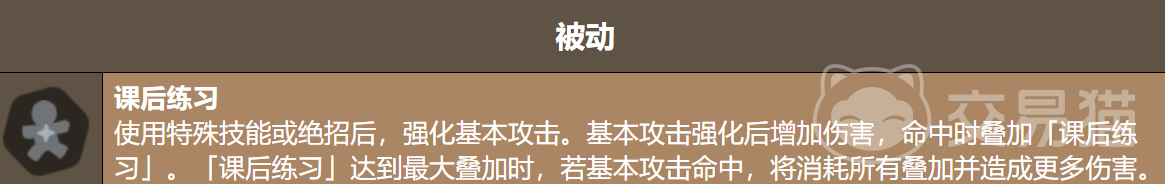 核心机制围绕被动技能「课后练习」展开——这是奶油苏打饼干战斗逻辑的中枢。每当释放特殊技能或绝招后,基础攻击将自动进入强化状态;在此状态下,每次普攻均可叠加一层「课后练习」效果,叠至满层(共5层)后,下一次普攻将消耗全部层数并触发高额范围伤害。该机制强调技能衔接与时间管理,若强化状态结束前未能完成叠层,则已积累层数将自动清空,因此需精准把握输出窗口。