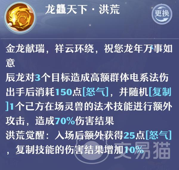 辰龙定位为群攻型法术战宠,主属性为雷系,可对敌方最多3个目标施放群体法术伤害,单次消耗150点怒气。其核心机制为“技能复制”:行动时随机选取一名己方在场战宠的主动法术进行复刻,并发动一次额外攻击,复制技能基础伤害略低于原技能。觉醒后,辰龙入场即获得初始怒气值,且复制技能的最终伤害效果获得显著增强。
