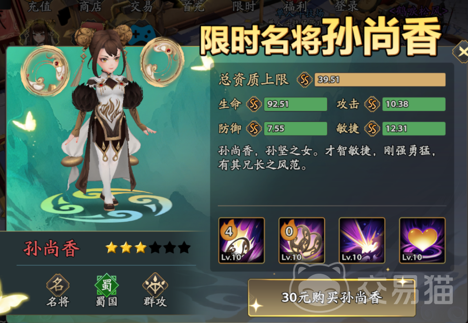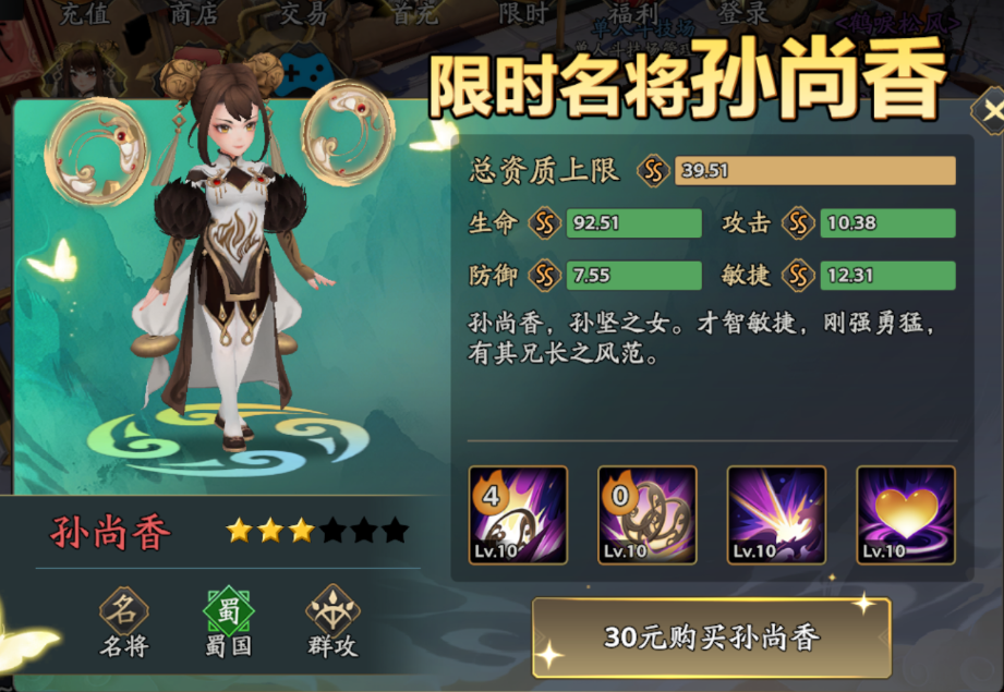 限时武将销售是另一重要付费节点。当前测试版本推出孙尚香限时折扣获取活动。该角色定位为群体伤害型武将,技能机制适配主流战斗结构——即1名精英单位搭配多数量杂兵的关卡设计,能有效压缩清场时间,提升副本通关效率与日常刷图体验。