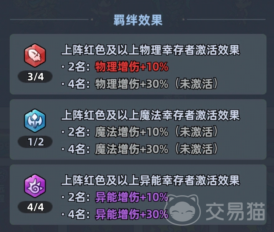 按职业维度细分,羁绊还支持定向输出强化:例如,当队伍中部署2名红色及以上品质的物理系幸存者时,全队物理伤害提升10%;若达到4名,则增幅升至30%。同理,魔法系与异能系职业亦遵循相同规则,分别触发对应类型的伤害加成。