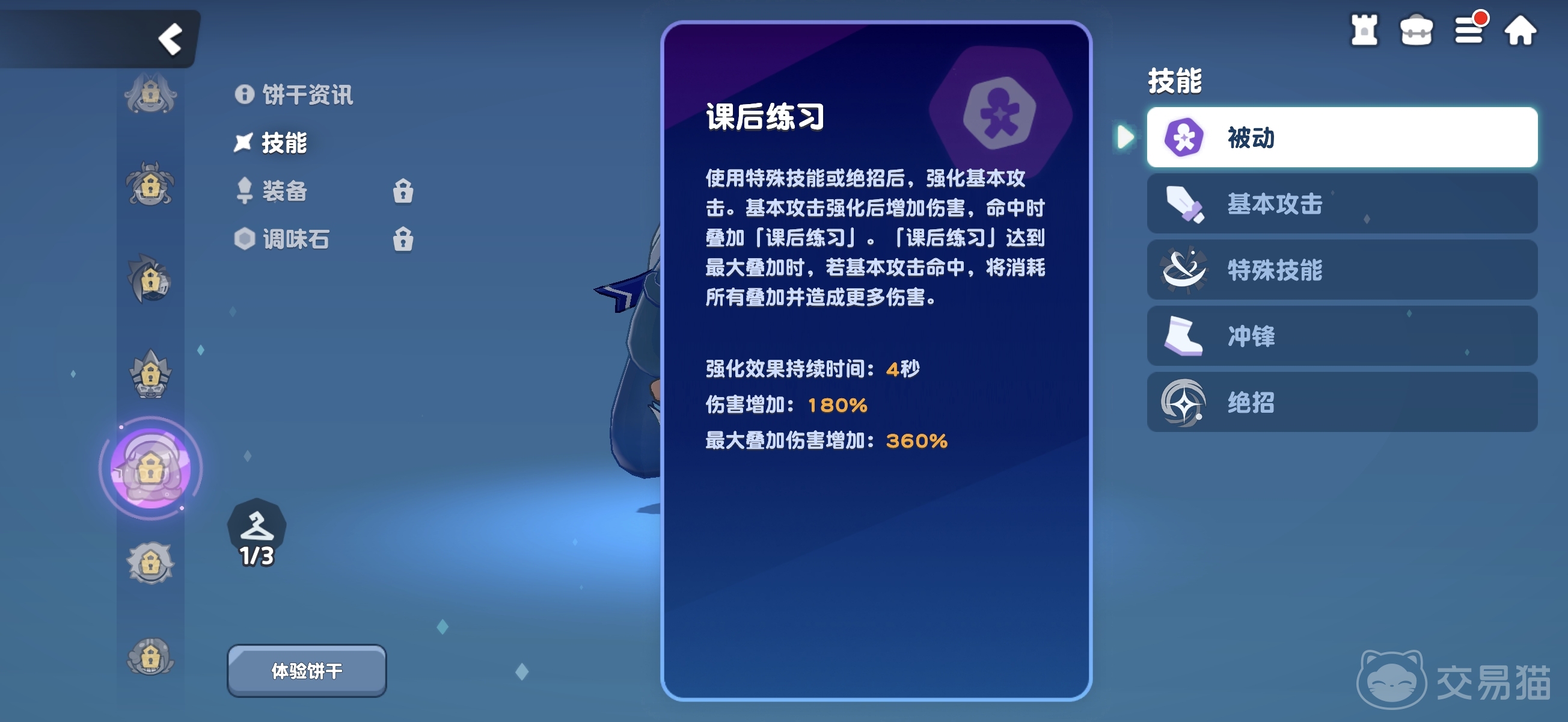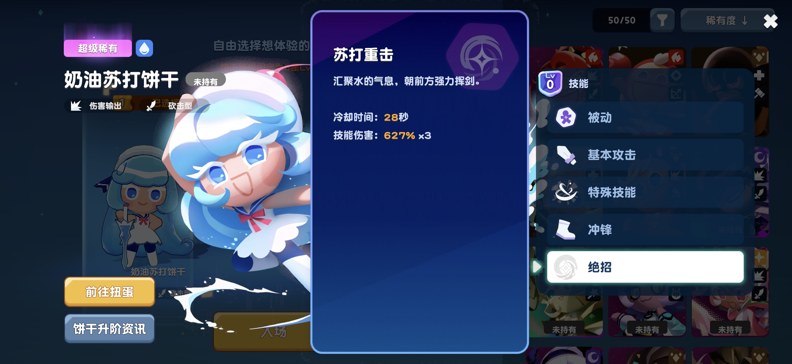 奶油苏打饼干为近战砍击型输出单位,核心定位是水属性主C。其被动机制围绕“强化普攻”展开:每次释放特殊技能或绝招后,基础攻击将获得强化效果,命中目标可叠加层数;叠满后消耗全部层数发动一次高倍率伤害的终结普攻。该强化状态持续4秒,要求玩家精准把握技能衔接窗口,形成“技能→强化普攻→技能→强化普攻”的稳定循环链。特殊技能具备三段连续挥砍,绝招则为单体高额前方斩击,整体操作门槛低但输出节奏感强。