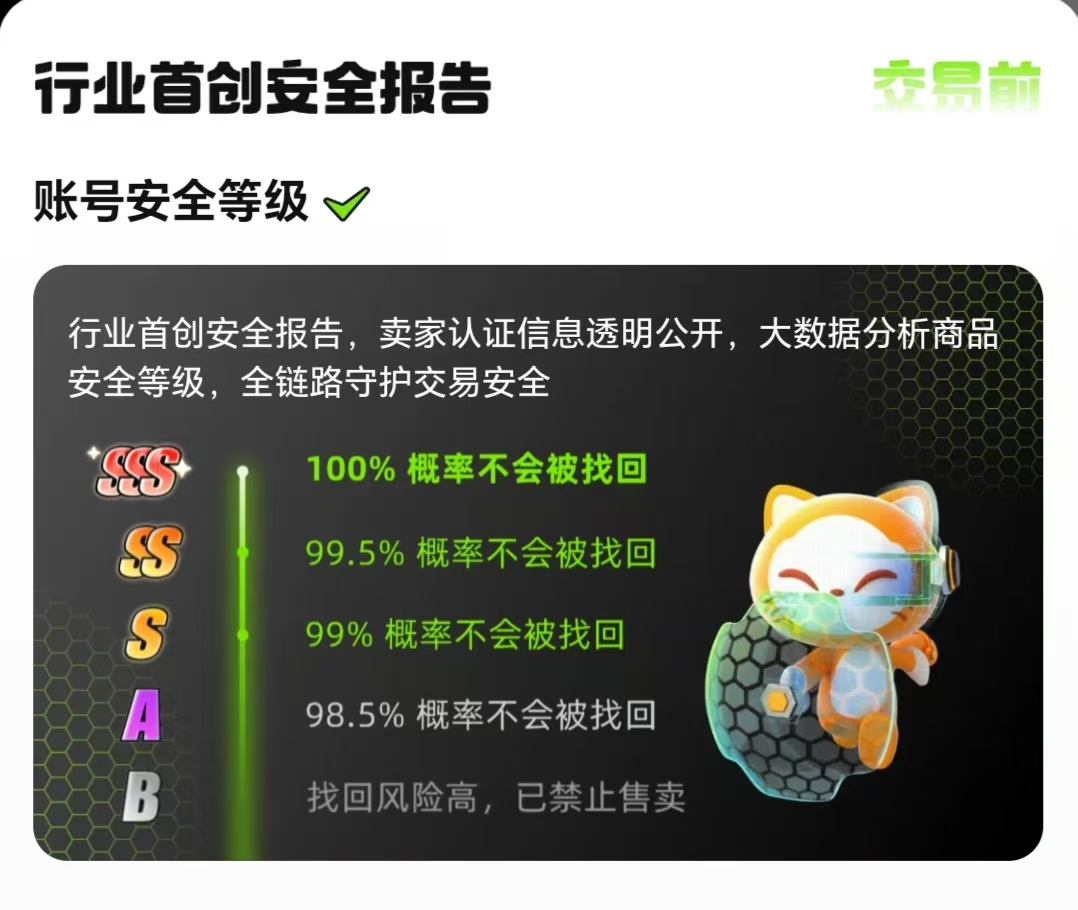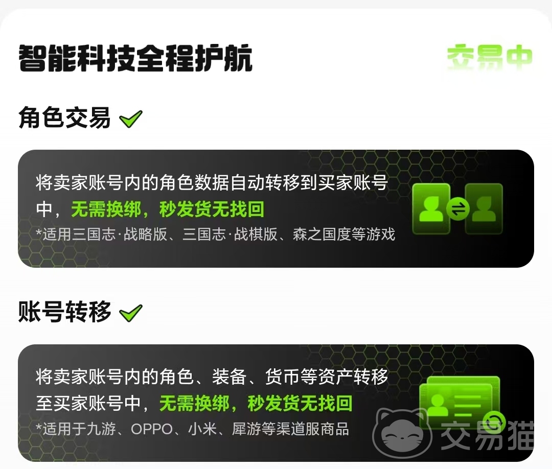 交易猫在服务中对客户处处体现贴心关怀。对于卖家,交易完成之后最快1小时内可以提现,迅速缓解其资金的压力,对于买家客服团队可提供24小时在线解答疑问,从怎么选账号到换绑每一步都可提供指导和陪伴,即使是新手也可以在耐心细致的引导下完成全部的操作。无论是角色交易还是账号转移都有智能科技为之保驾护航。