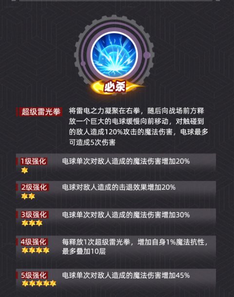 技能培养需严格遵循优先级逻辑。首推将主动技【超级雷光拳】升至135级——该技能不仅承担主要伤害输出职责,更是触发后续增益循环的基础。其次重点提升【雷龙拳】至满级,该技能拥有40%的普攻触发概率,且每次命中可造成280%魔法攻击力的雷电伤害。配合攻击速度类装备,可实现高频次、高密度的连锁雷击,在短时间窗口内形成压制性输出节奏。