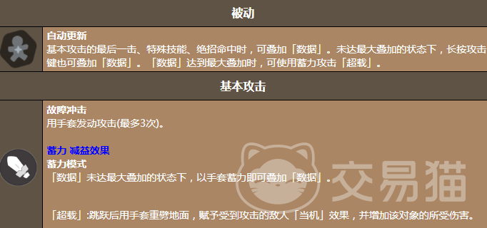 该角色属于典型的“数据驱动型”近战输出者,主武器为特制战术手套。普攻由三段连续挥击组成,具备明确的节奏设计:第三段命中后可立即触发数据能量叠加;若未达满层,持续点击普攻键仍可稳定累积能量。当数据值蓄满时,自动激活蓄力攻击——跃起后重劈地面,对范围敌人造成高额伤害并附加易伤效果,使后续所有伤害提升,成为破盾、压血线与终结的关键节点。