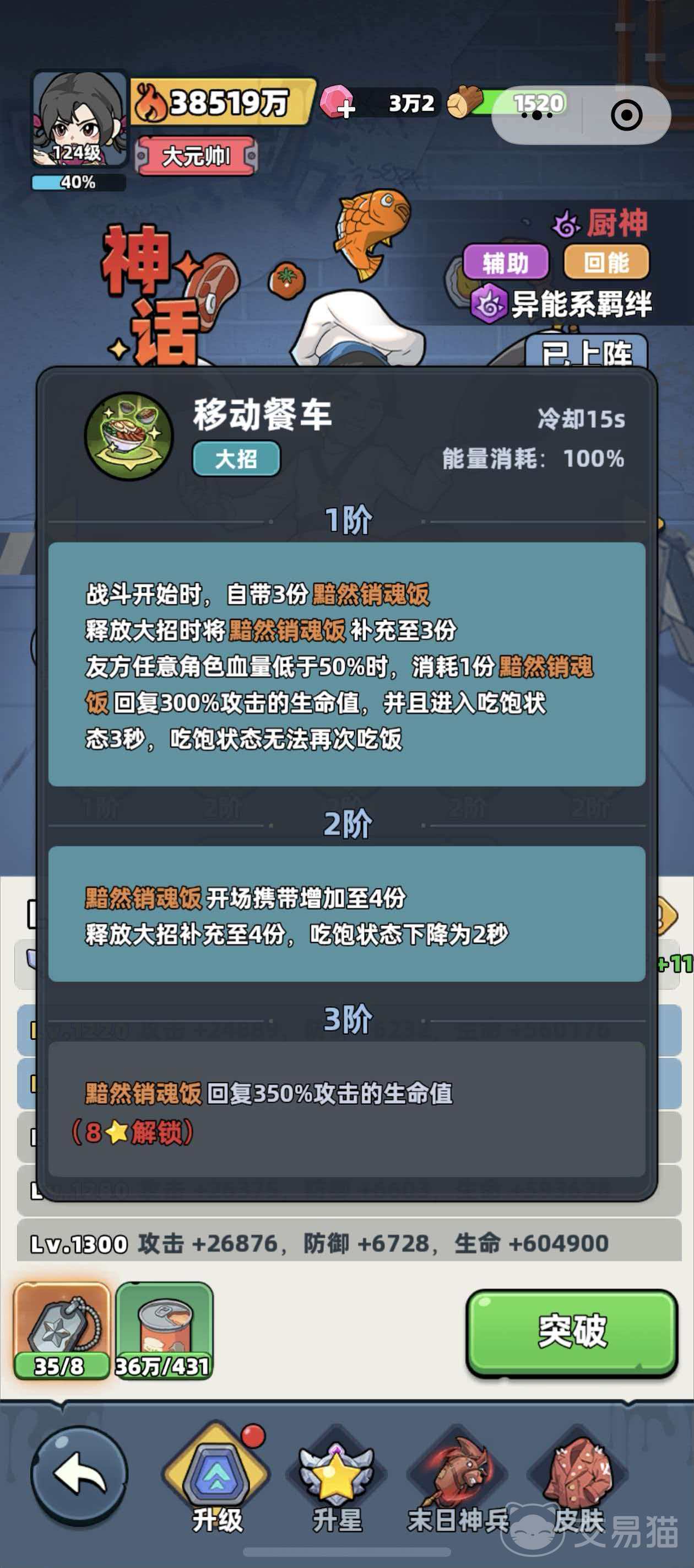 厨神归属于异能系羁绊,核心功能为能量恢复与持续生命续航。其主动技能“投喂”可对当前血量百分比最低的4名队友施加食物效果,每叠加1层“真好吃”状态,即恢复目标20%攻击力数值的生命值;大招“移动餐车”在战斗初始即赋予自身3份“黯然销魂饭”,每份可恢复300%攻击力的生命值,并使目标进入“吃饱”状态,该状态可提升后续治疗收益效率。