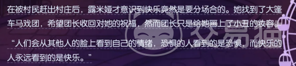 村民由初时的新奇渐转为不安,最终将她驱离故土。彼时她方知,“快乐”并非普适状态,而是需契合情境的情绪语言。被放逐后,她寻回当年马戏团,恳请解除祝福。团长未予撤销,仅以油彩勾勒小丑妆容,并道出关键箴言:“世人所见他人神情,实为自身心象投射——畏者见怖,悦者见欣。”这句话成为她身份重构的支点。自此,露米娅蜕变为乐园小丑,以固定笑容为面具,承载流动的自我认知。
