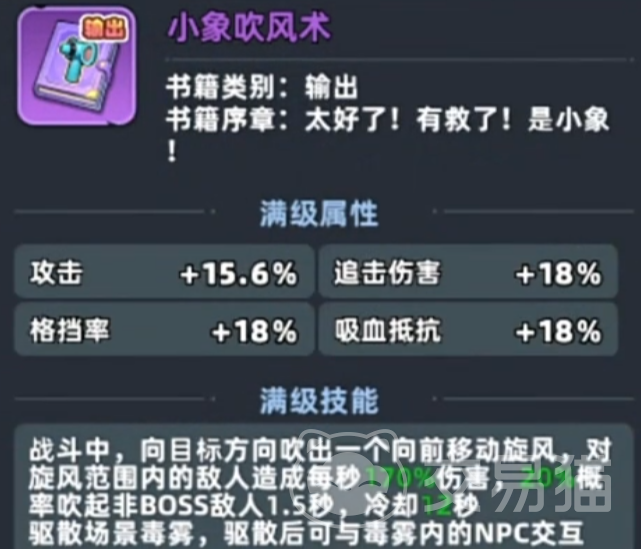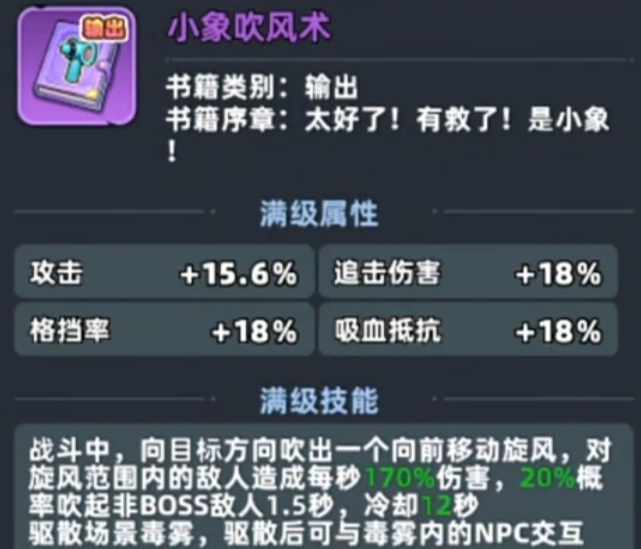 第二种方案依赖特定书籍——紫色品质技能书《小象吹风术》。该书可在地图各处搜集获得,装备后可在战斗中向前方释放一道旋风,既可对敌人造成范围伤害,亦能有效清除路径上的毒雾,具备战术与功能性双重价值。