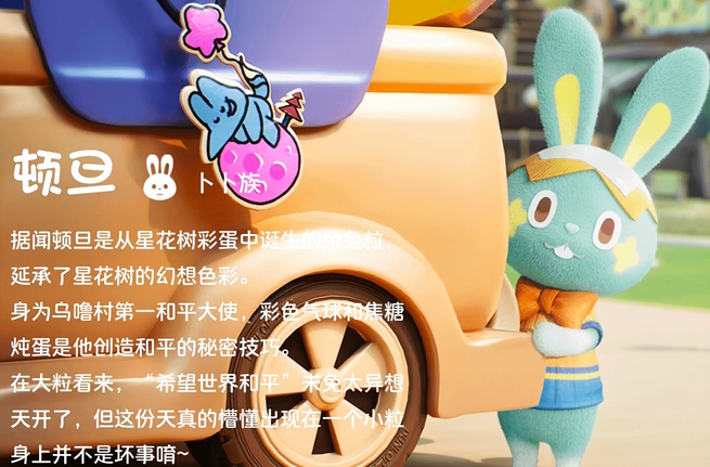 顿旦为特殊诞生个体,源自星花树彩蛋,担任乌噜村和平大使。视觉标识为悬浮彩色气球及焦糖炖蛋气味粒子效果,整体表现偏向童话叙事基调。其任务机制聚焦非对抗式冲突调解,通过赠礼与共情对话推动剧情发展,触发内容多围绕社区关系修复与情感联结展开。