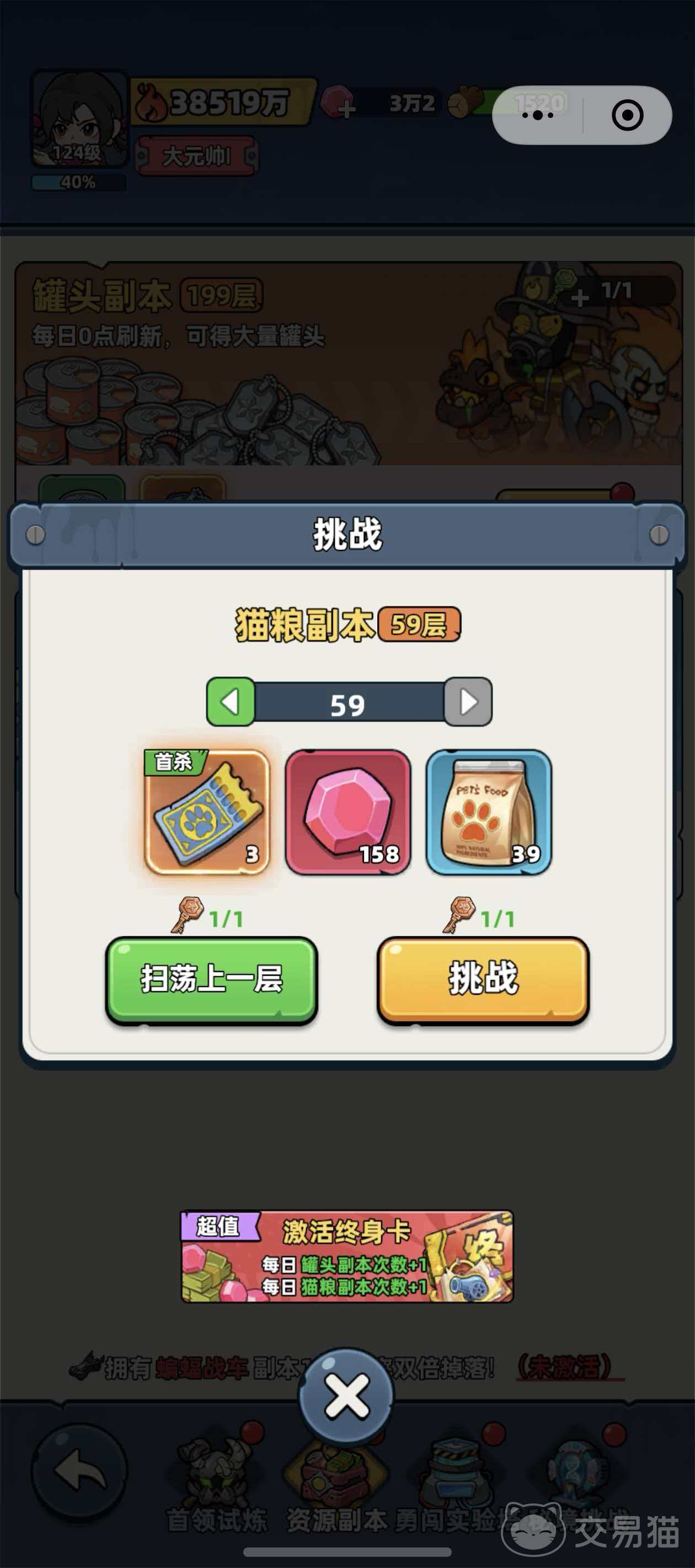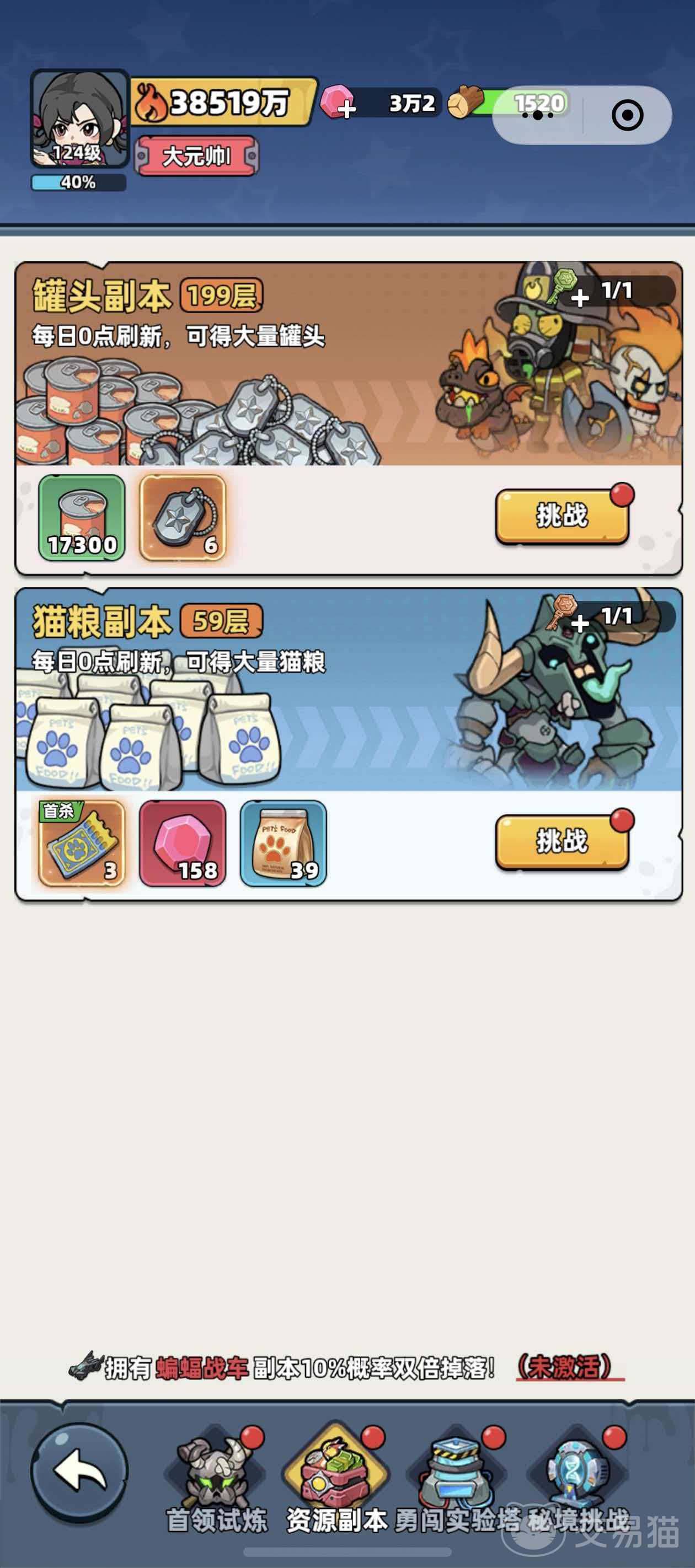 资源副本是更为稳定可控的猫粮来源,入口位于主界面的“挑战大厅”。该区域包含两类专项副本:罐头副本与猫粮副本。猫粮副本需角色等级达到排长后方可解锁,其关卡难度高于罐头副本。成功通关一次猫粮副本,可固定获得39包猫粮及158钻石;若达成该副本的首次通关(即首杀),还将额外奖励3张宠物契约券。