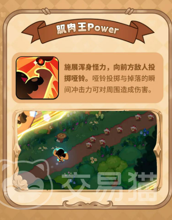 其主动技能命名为“肌肉王Pover”,冷却时间为10秒。释放时向正前方投掷哑铃,落地瞬间触发范围冲击波,对以落点为中心的周围敌人造成群体伤害。初始等级下伤害倍率为81%,虽单次数值不属顶尖,但凭借稳定的AOE覆盖能力,在应对复数目标时展现出良好战术价值。