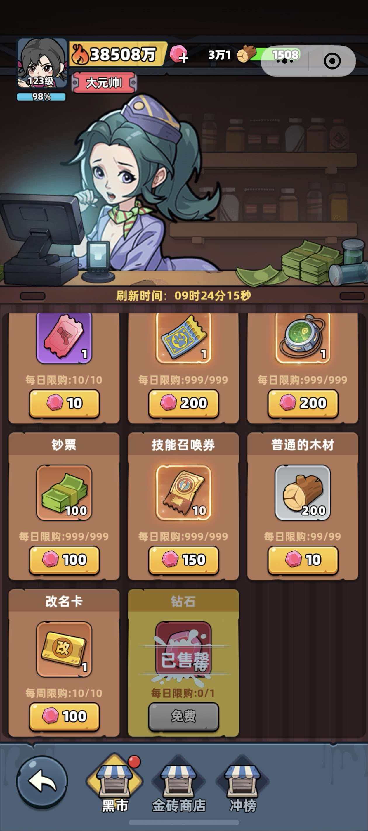 除自主采集外,黑市为另一稳定木材来源。操作路径为:点击屏幕右侧【更多】→进入【黑市】→向下滑动至【普通木材】商品栏。确认所需数量后即可完成购买。当前定价为10格粉钻兑换200根木材,属高性价比选项。但需留意限购规则:每日最多可购99份(即每份按实际购买数量计算,总份数上限为99),建议在木材紧缺周期优先使用该渠道补足缺口。