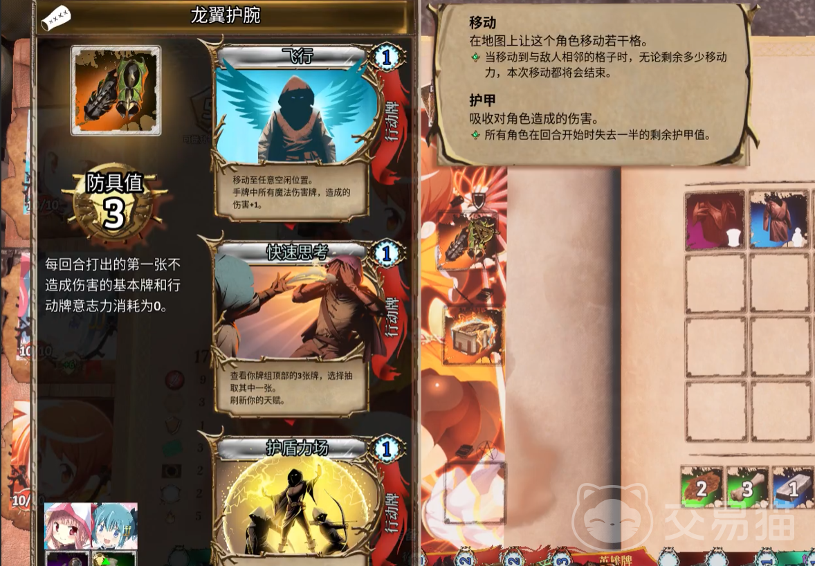 维持节奏流畅性依赖于“快速思考”这张关键过牌手段。其效果为展示牌组顶三张牌,并允许从中抽取一张加入手牌,显著提升关键卡(如烈焰扇+、火焰召唤)的上手率。在灼烧流中,手牌调度直接决定爆发窗口是否成型。此外,图中所示的“龙翼护腕”提供3点护甲值与“飞行”特性,既增强承伤容错,又赋予角色无视地形障碍的机动自由度,使其能灵活切入战场或脱离高压区域。
